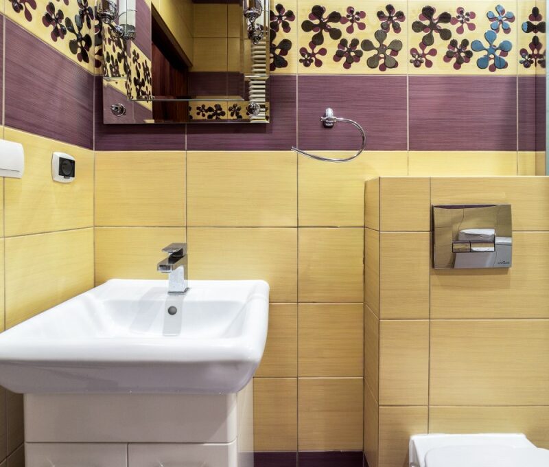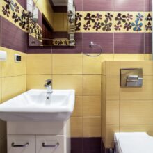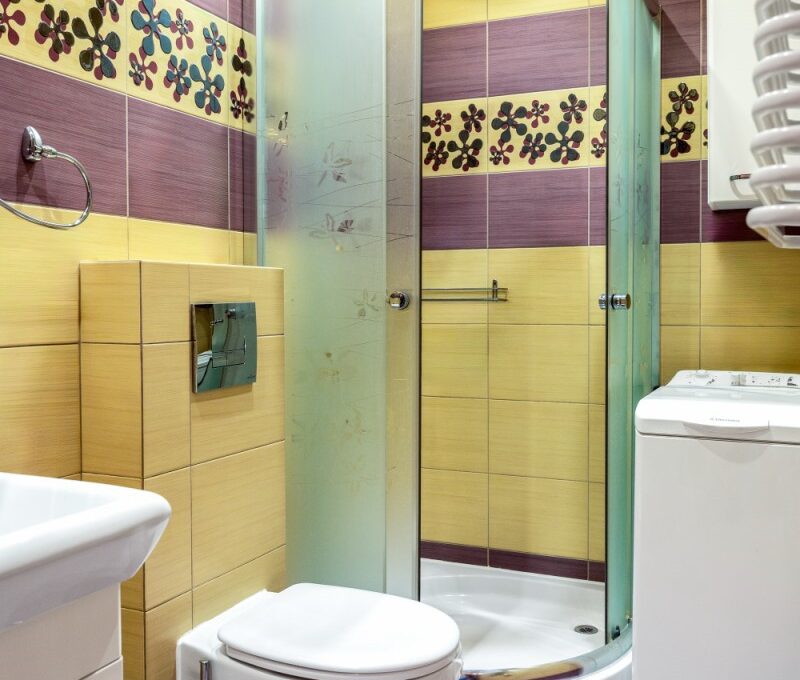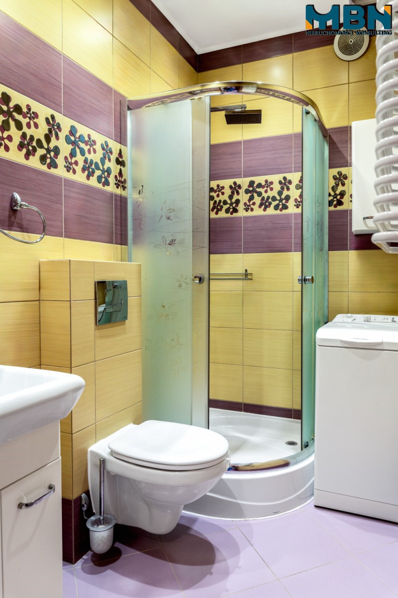 Łazienka: o pow. ok. 3,08m2, glazura, terakota, WC, prysznic z kabiną narożną, umywalka, pralka;