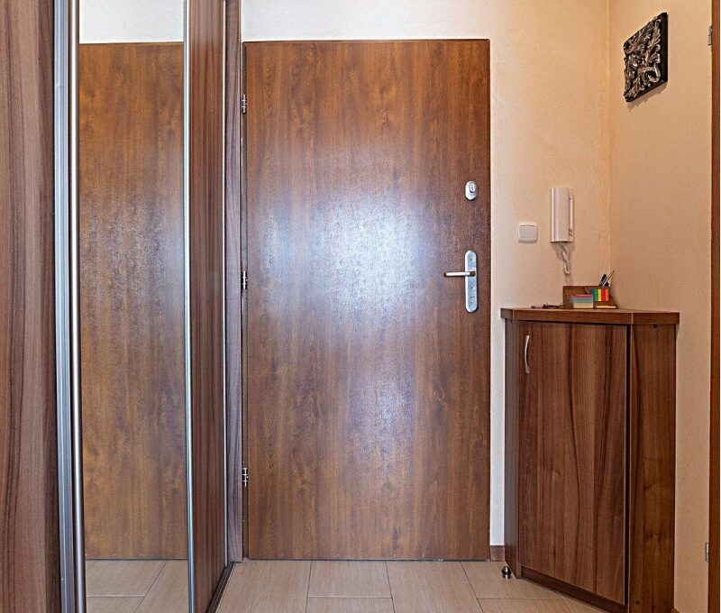 Przedpokój o pow. 4,18m2 zabudowano pojemnymi szafami na wymiar;