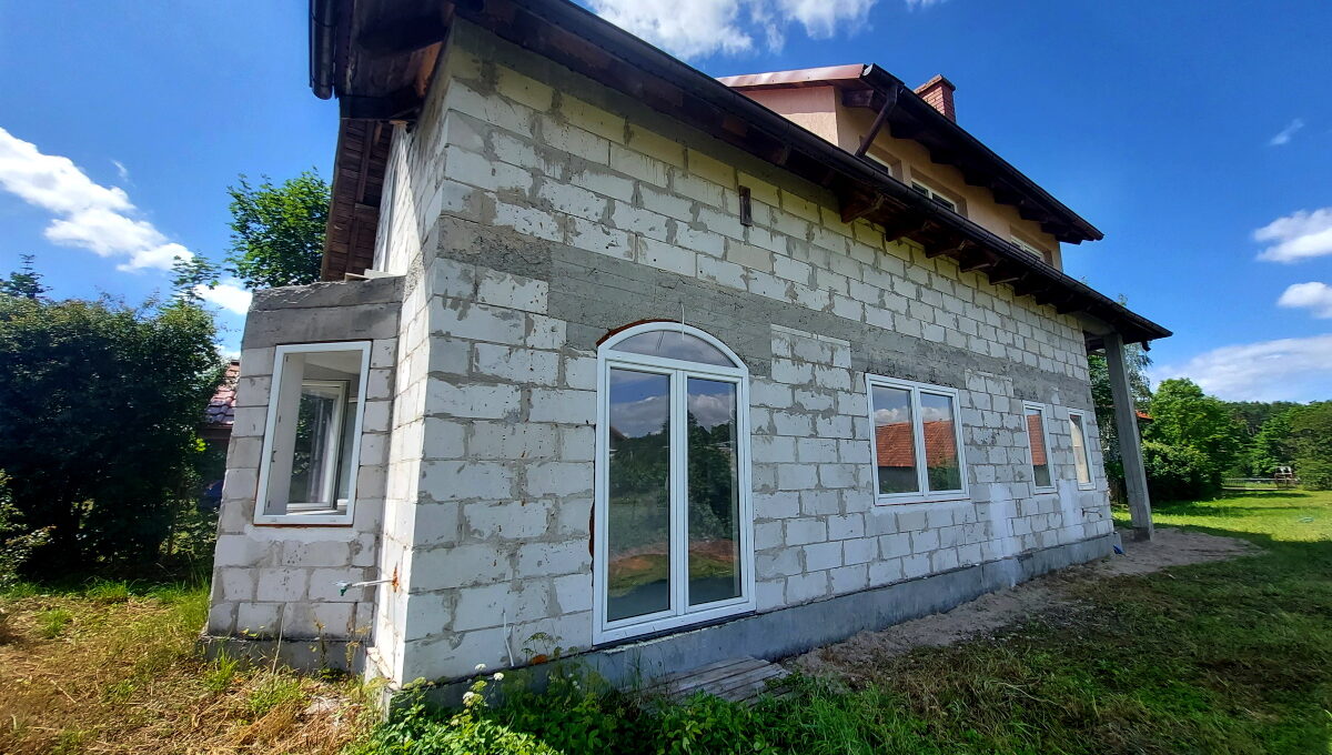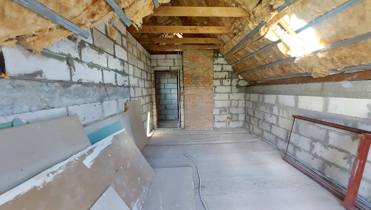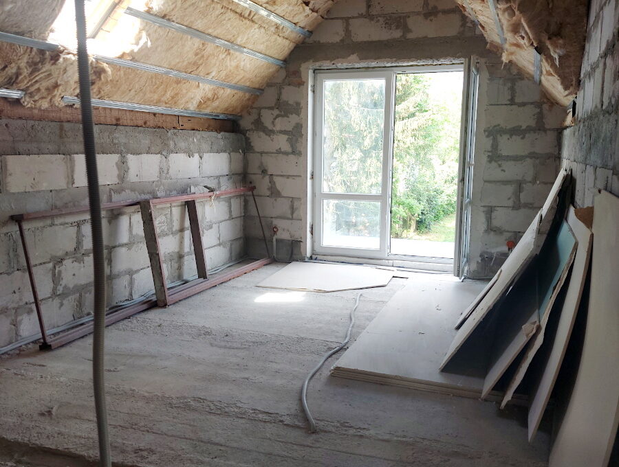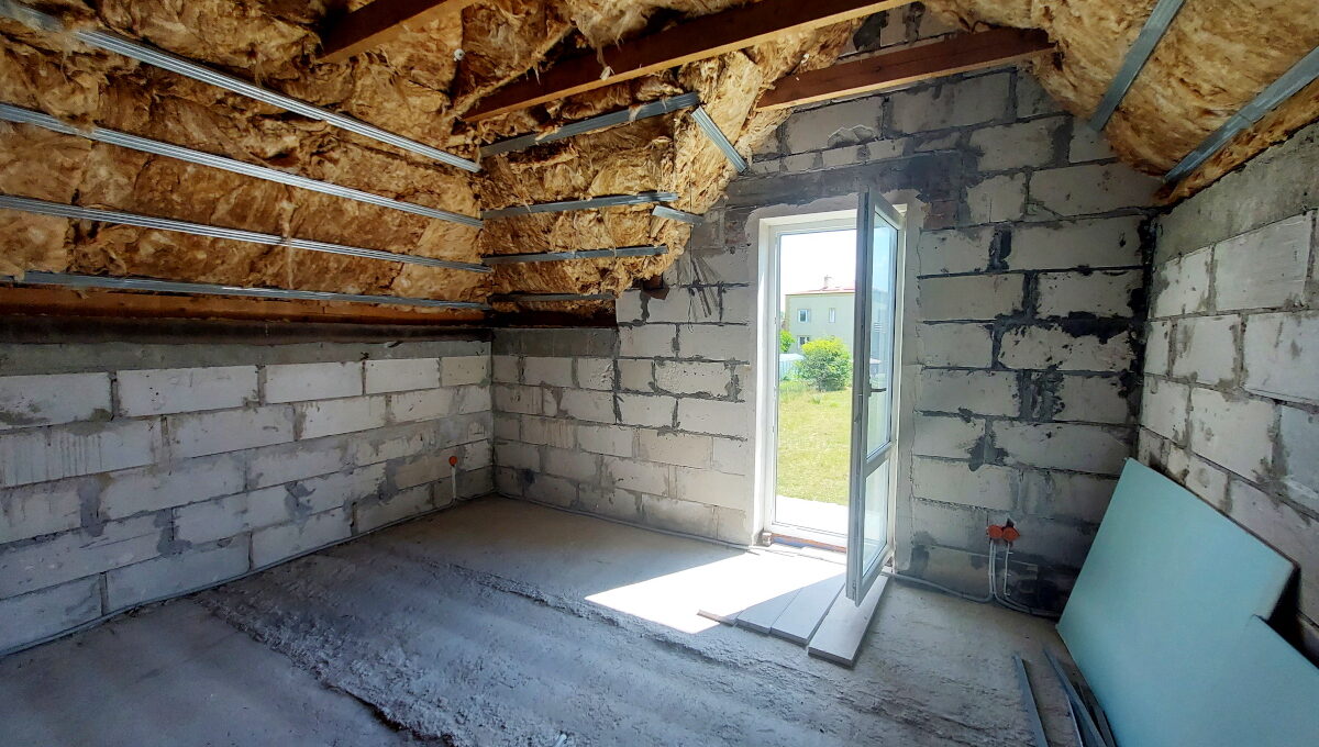 Piętro budynku nieotynkowane, poddasze ocieplone wełną mineralną;