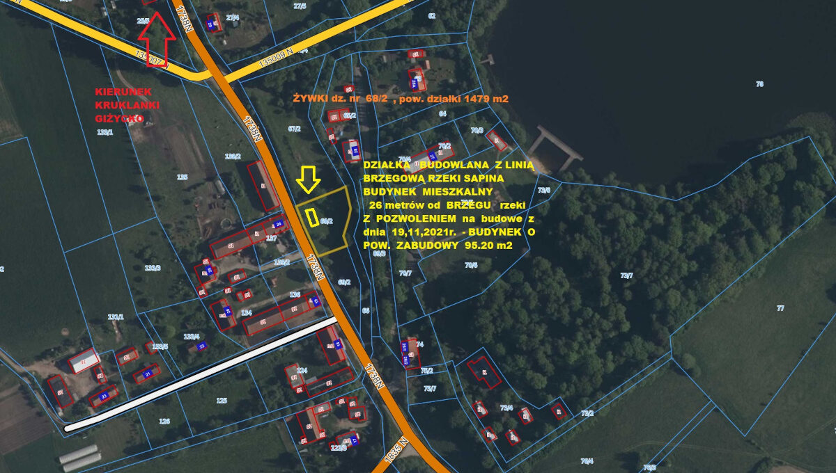 Działka budowlana o pow. 1497m2 położona nad rzeczką w odległości ok 150m od plaży gminnej jez. Żywki Żywki gmina Kruklanki