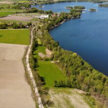 Teren płaski,wyniesiony ponad asfalt, widok boczny na jezioro;
