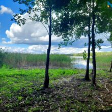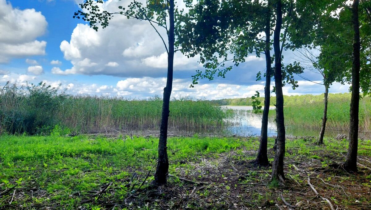 Teren przy jeziorze zadrzewiony, uporządkowany;