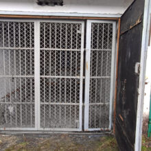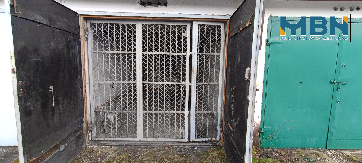 - Brama garażowa: metalowa, dwuskrzydłowa, dodatkowo brama metalowa, dwuskrzydłowa, wewnętrzna z siatką;