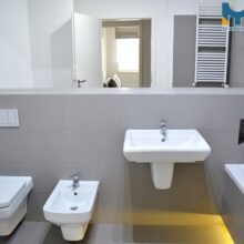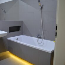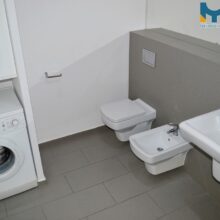 Łazienka: o pow. ok. 6,70 m2 glazura, terakota, toaleta, bidet, wanna, umywalka z szafką, duże lustro, grzejnik typu suszarka, pralka;