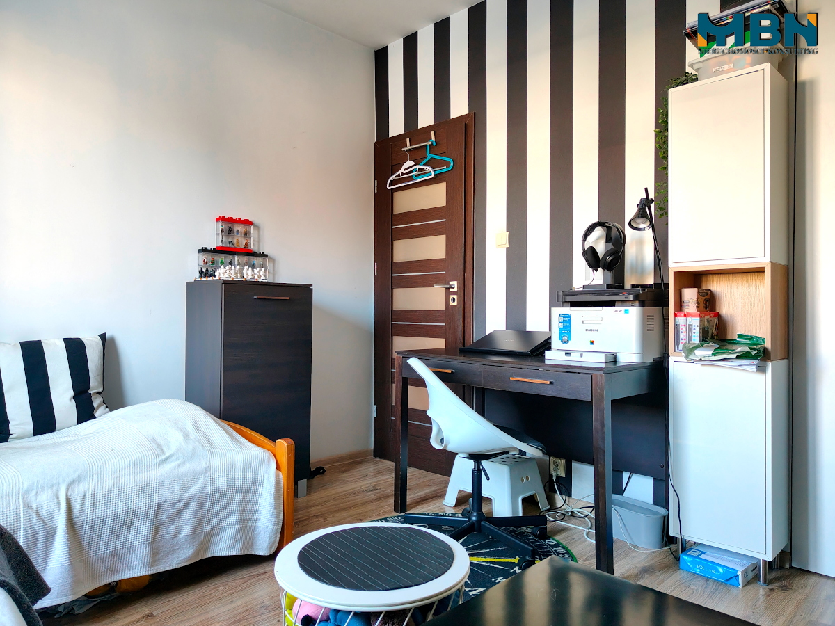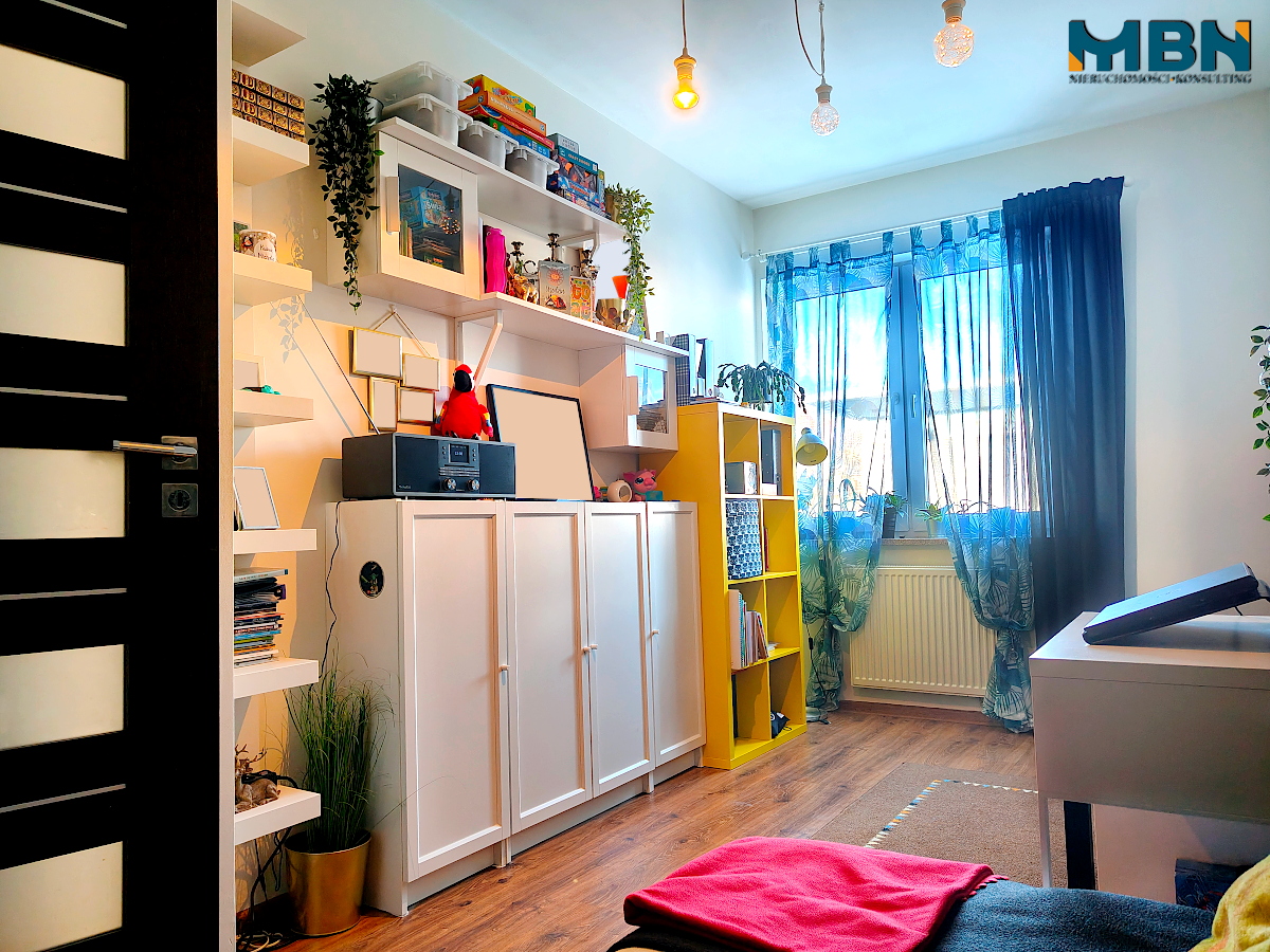 Ilość pokoi: 3 – salon z aneksem kuchennym, dwa pokoje, przedpokój z garderobą, łazienka z WC;