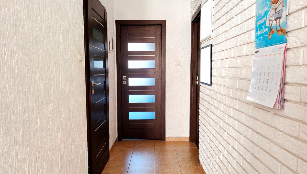 - Drzwi wewnętrzne i futryny: w kolorze ciemny brąz, drzwi z mleczną szybą;