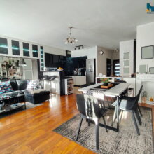 - Aneks kuchenny: pow. ok 6,40m2, zabudowa na wymiar, płyta ceramiczna indukcyjna Whirlpool, piekarnik elektryczny Bosch, okap kominowy Elica, zlew jednokomorowy z półką, duża lodówko-zamrażarka Samsung, zmywarka Whirlpool;