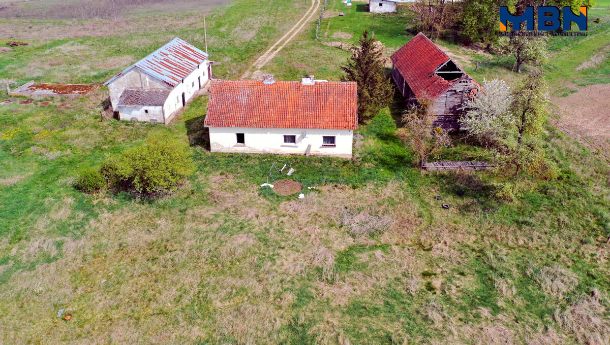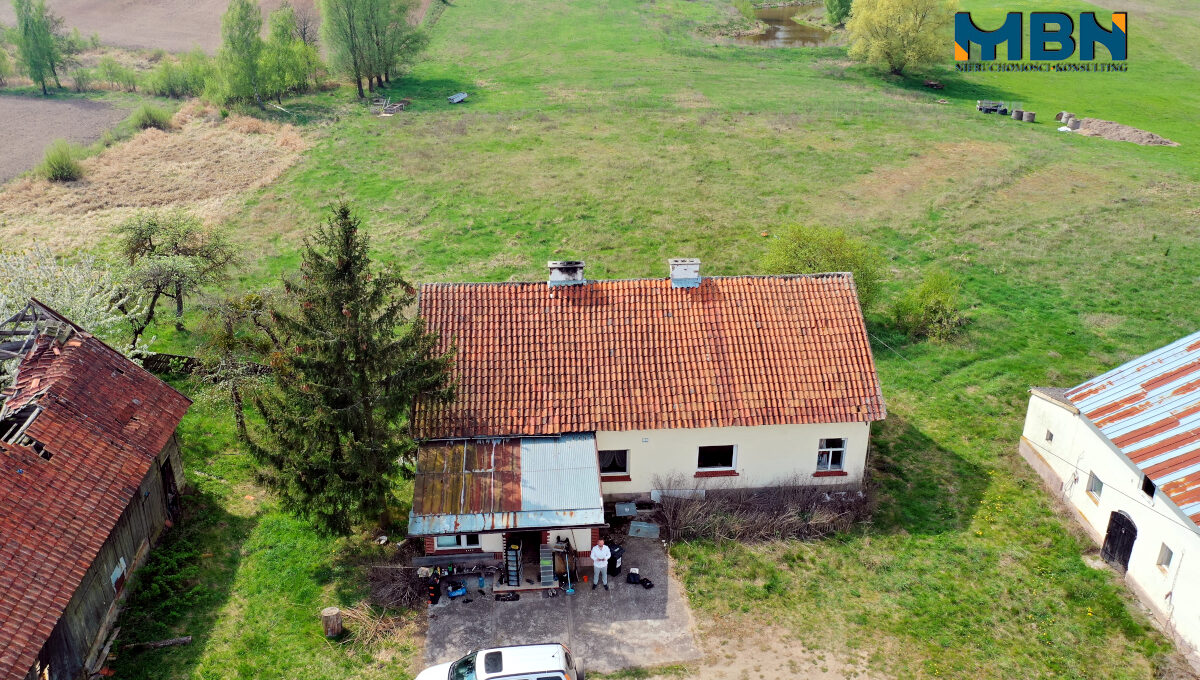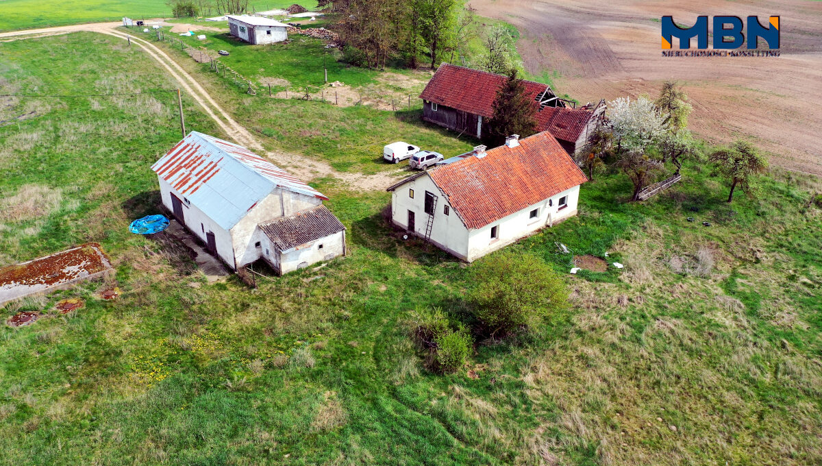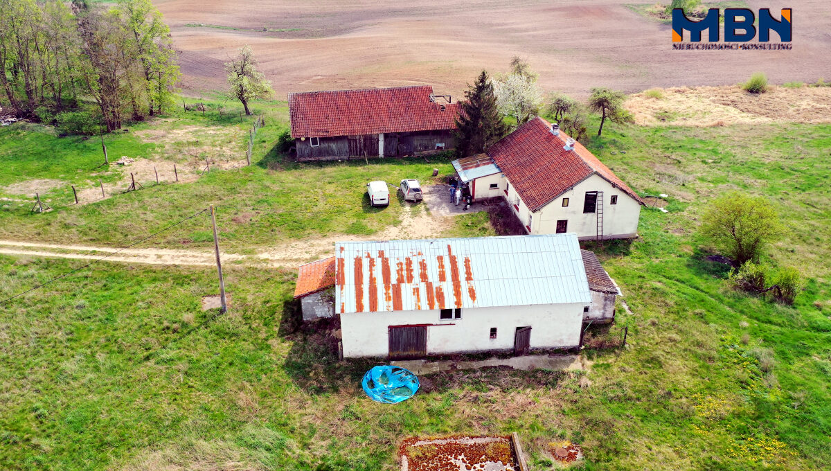 Nieruchomość zabudowana budynkiem mieszkalnym jednorodzinnym oraz budynkami gospodarczymi położona na terenach rolnych wśród łąk i pól.