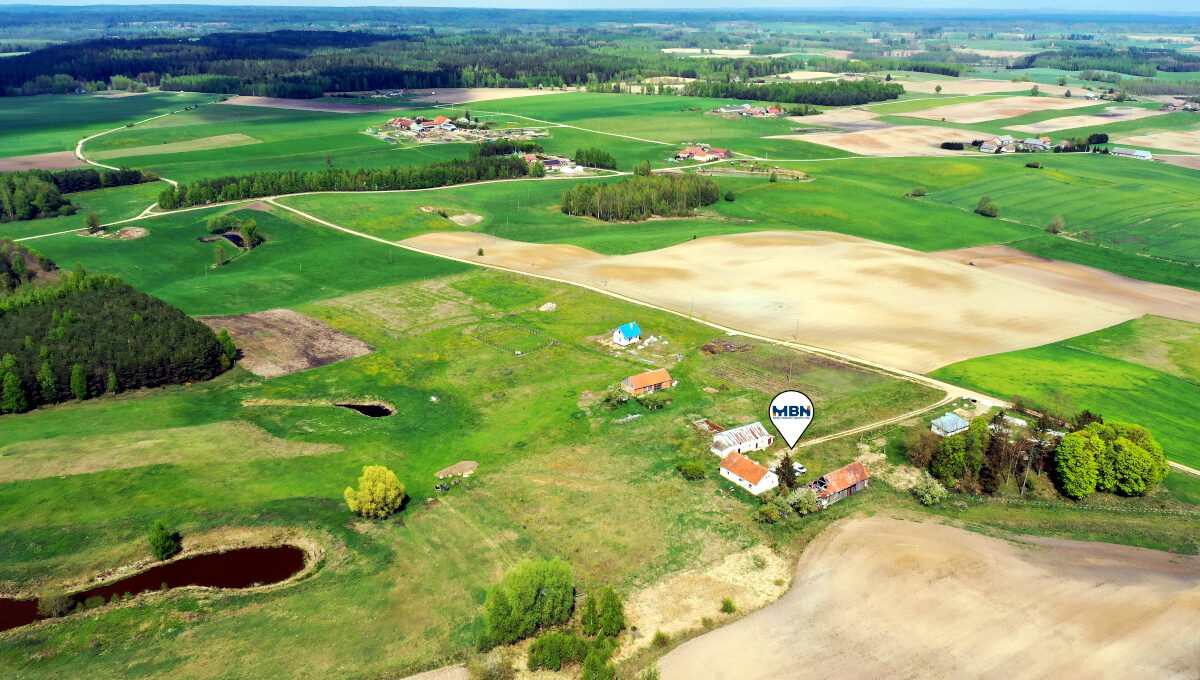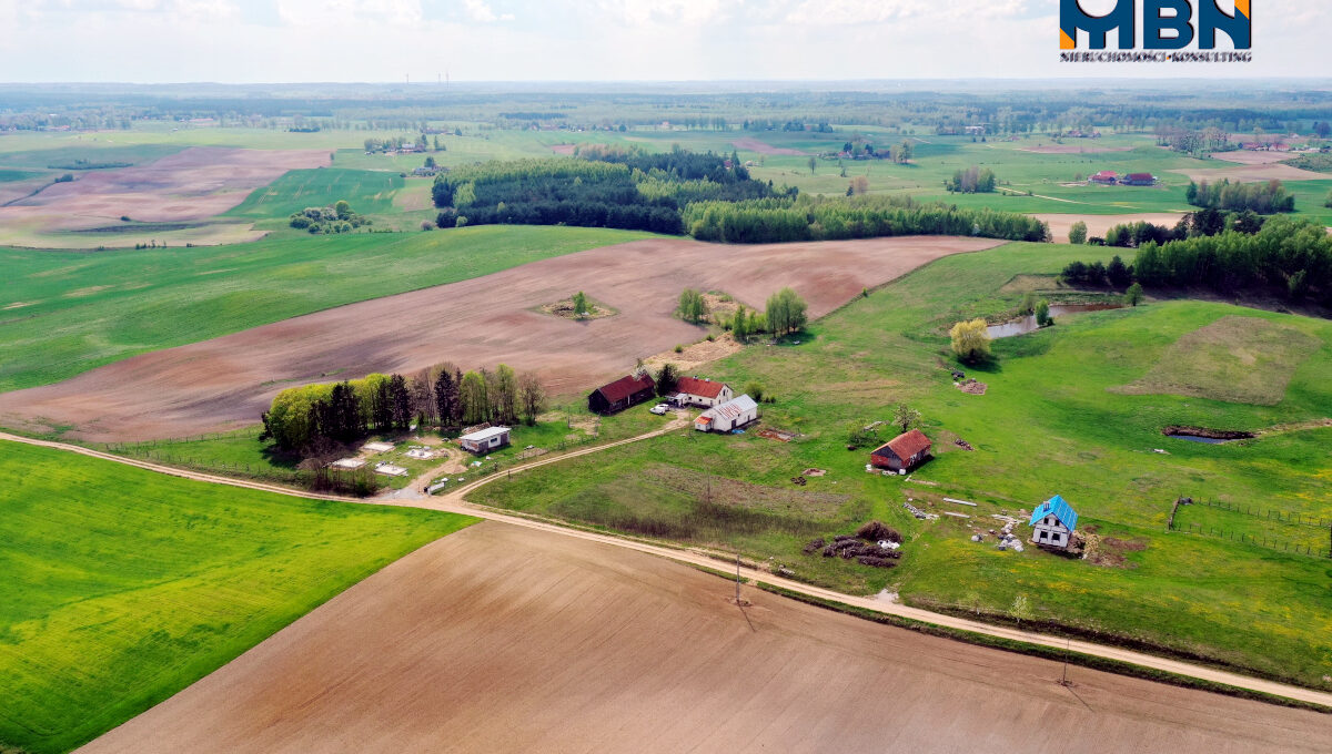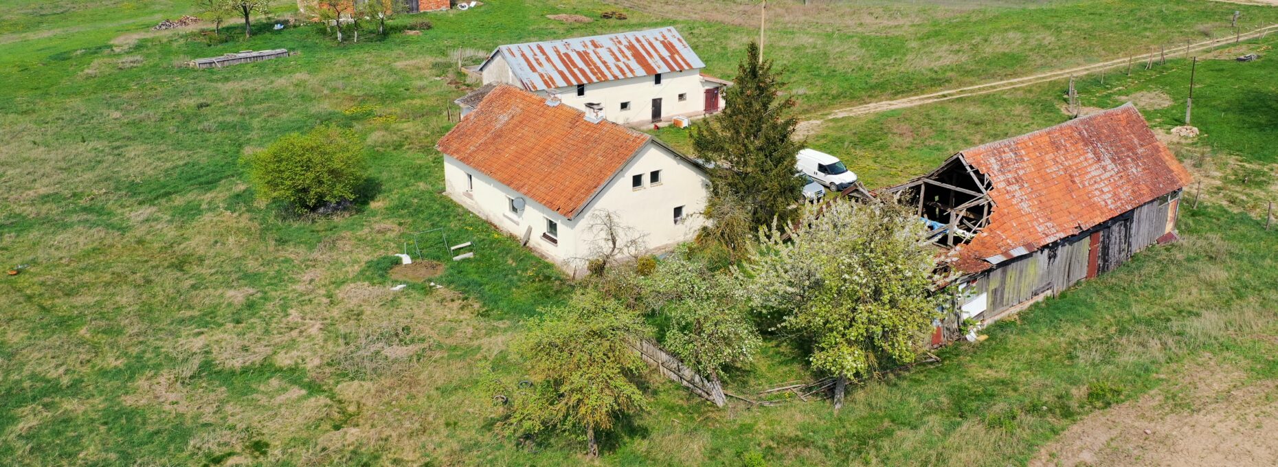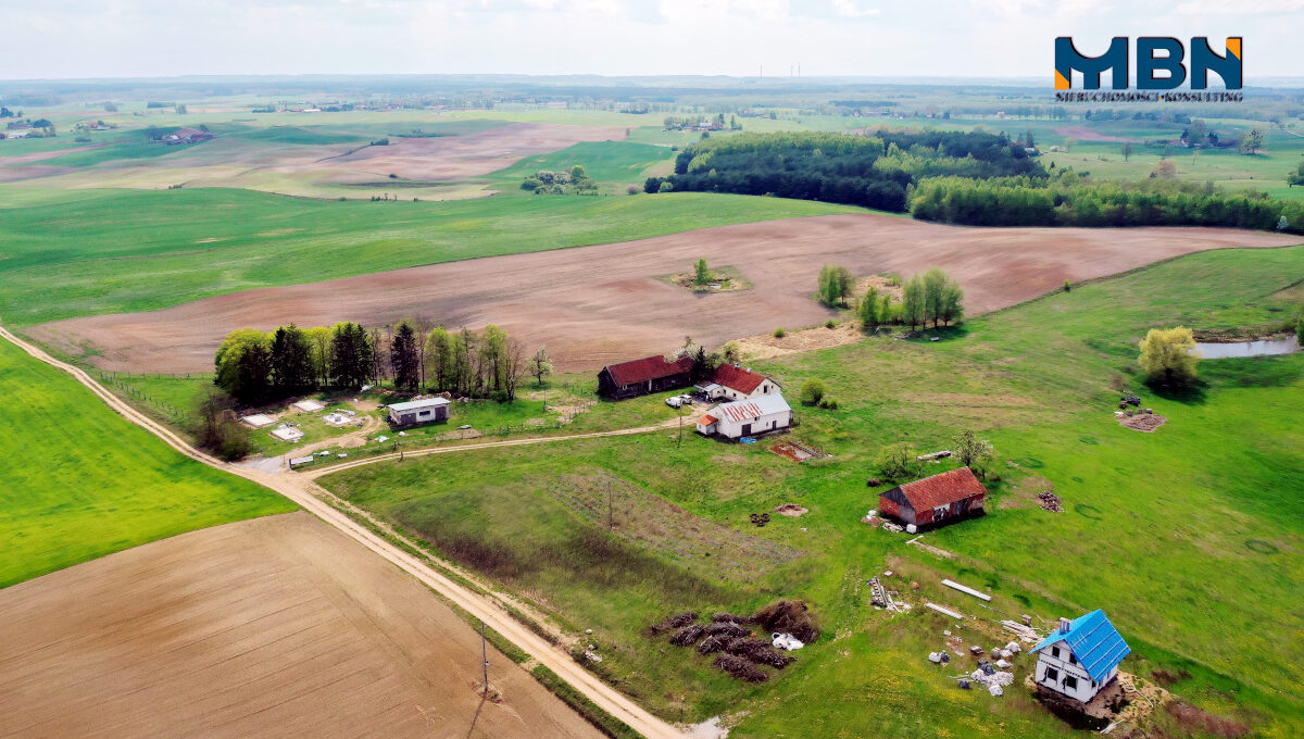 Nieruchomość zabudowana budynkiem mieszkalnym jednorodzinnym oraz budynkami gospodarczymi położona na terenach rolnych wśród łąk i pól.